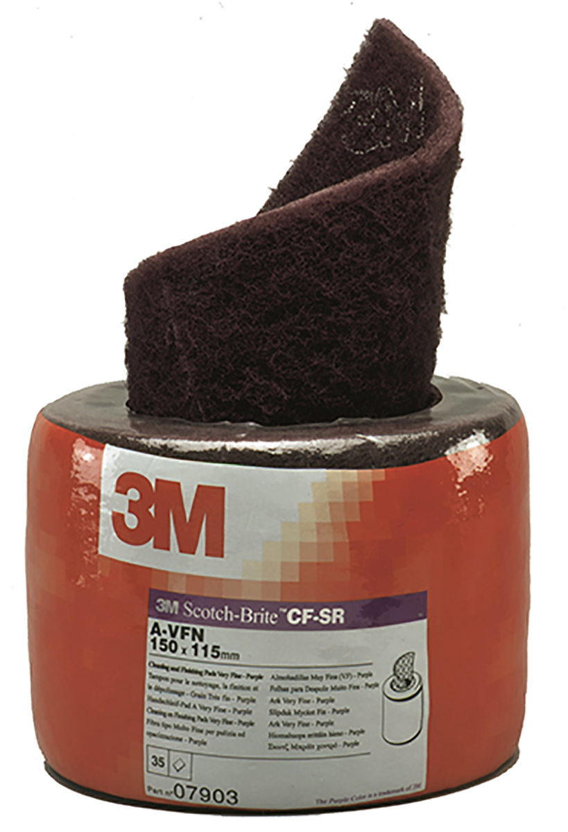 This is Very Fine VFN Abrasive Hand Pad Aluminium Oxide 150mm x 115mm Scotch-Brite manufactured by 3M. The manufacturer part number is CF-SR 07903. The product is avfn, a grade of class. The product cf-sr, is a highly preferred choice for users. It has a model scotch-brite. It has a/an abrasive hand pad type sandpaper .