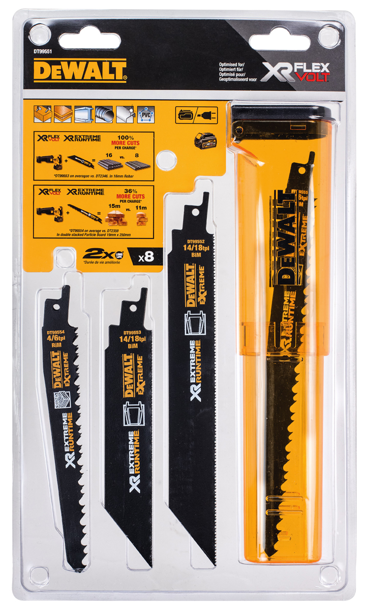 This is Dewalt 152 mm 203 mm Cutting Length Reciprocating Saw Blade 14/18 TPI 4/6 TPI Teeth Per Inch manufactured by DeWALT. The manufacturer part number is DT99551-QZ. It has 14/18 tpi, 4/6 tpi number of teeth per inch . It is designed with a reciprocating saw blade type saw blade . It has about 152mm,203mm cutting length . Applications Information involves metal, plastic, pvc, wood. In addition, its blade is made up of steel material . It has 8 items per pack .