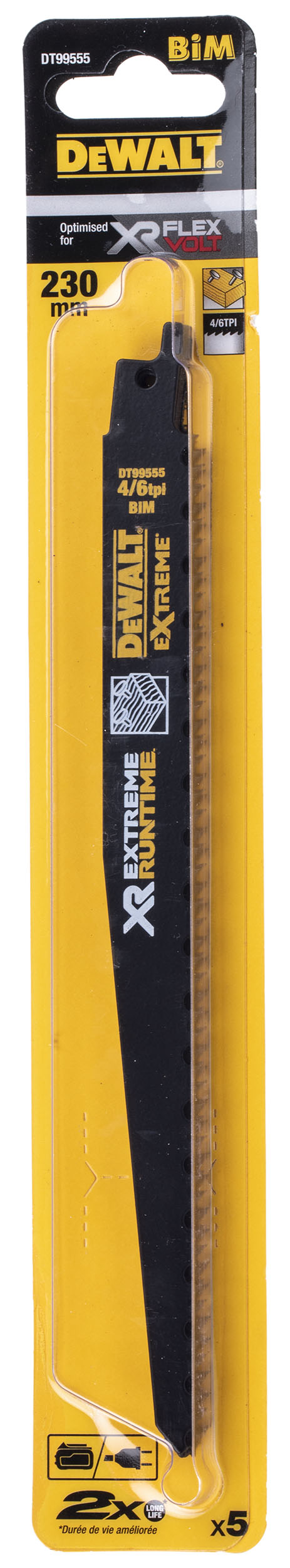 This is Dewalt 230mm Cutting Length Reciprocating Saw Blade 4/6 TPI Teeth Per Inch manufactured by DeWALT. The manufacturer part number is DT99555-QZ. It has 4/6 tpi number of teeth per inch . It is designed with a alligator saw blade type saw blade . It has about 230mm cutting length . Applications Information involves metal. In addition, its blade is made up of bi-metal material . It has 5 items per pack .