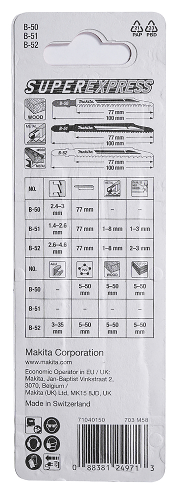 This is Jigsaw Blade Set 3 Pack manufactured by Makita. The manufacturer part number is B-06292. It has 3 items per pack . It has about 75mm cutting length . It is designed with a jigsaw blade type saw blade .