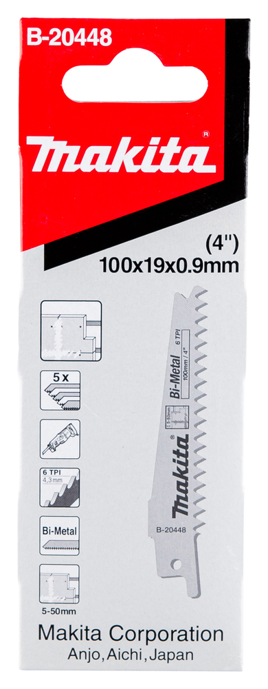 This is 100mm Cutting Length Bimetal Reciprocating Saw Blade 6 Teeth Per Inch Pack of 5 manufactured by Makita. The manufacturer part number is B-20448. It has 6 number of teeth per inch . It is designed with a reciprocating saw blade type saw blade . It has about 100mm cutting length . Applications Information involves plastic. In addition, its blade is made up of bi-metal material . It is bimetal yes . It has 5 items per pack .