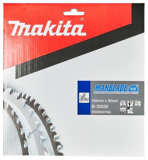 This is Circular Saw Blade Pack of 1 manufactured by Makita. The manufacturer part number is B-32530. Its arbor diameter is about 30mm . It has 1 items per pack . The blade diameter of the product is 260mm . It is designed with a circular saw blade type saw blade . It contains 70 teeth. In addition, its blade is made up of carbide material .