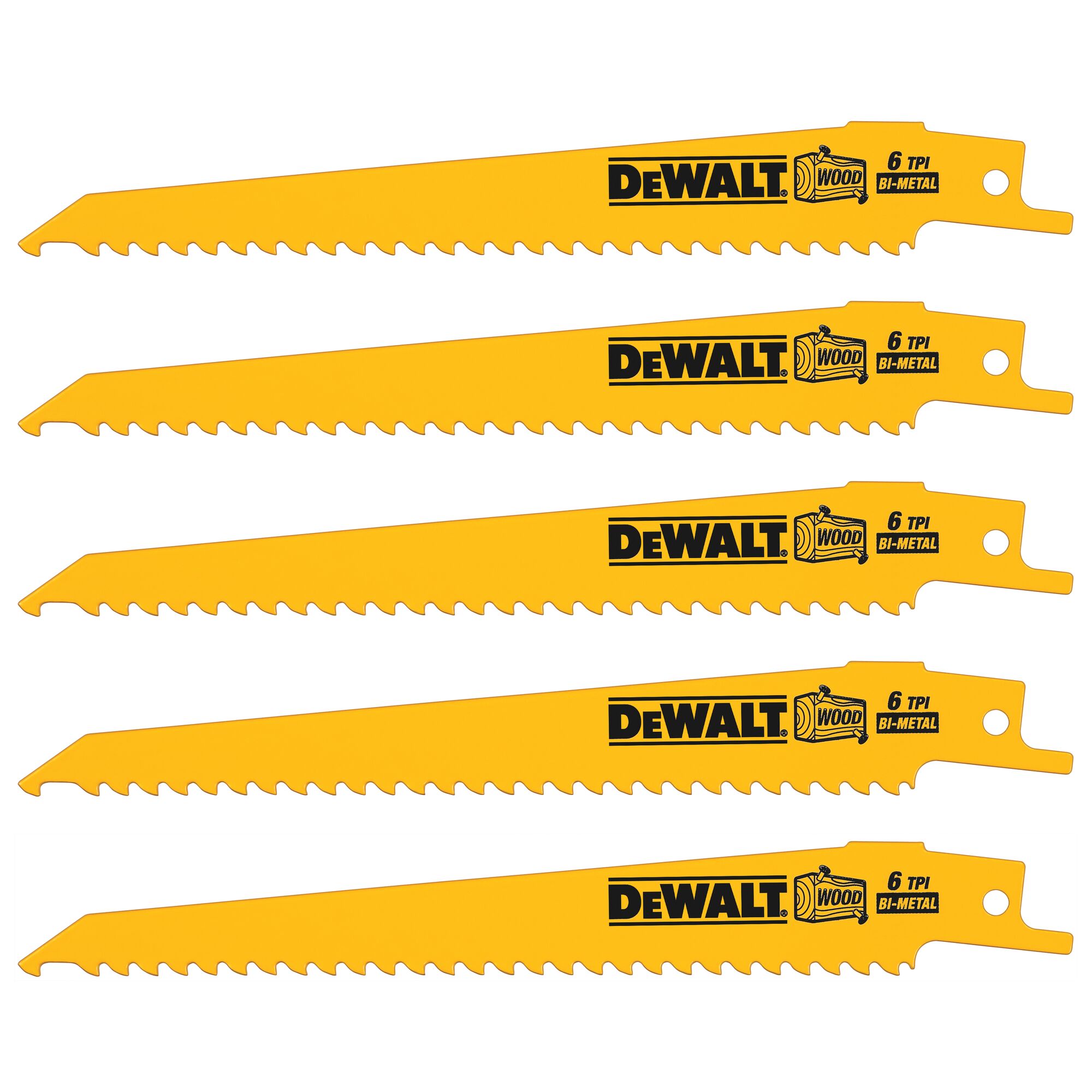 This is 6 Teeth Per Inch Wood 152mm Cutting Length Reciprocating Saw Blade Pack of 5 manufactured by DeWALT. The manufacturer part number is DT2359-QZ. It has 6 number of teeth per inch . It has 5 items per pack . It has about 152mm cutting length . Applications Information involves cutting. It is offered to cut wood materials . It is designed with a reciprocating saw blade type saw blade .