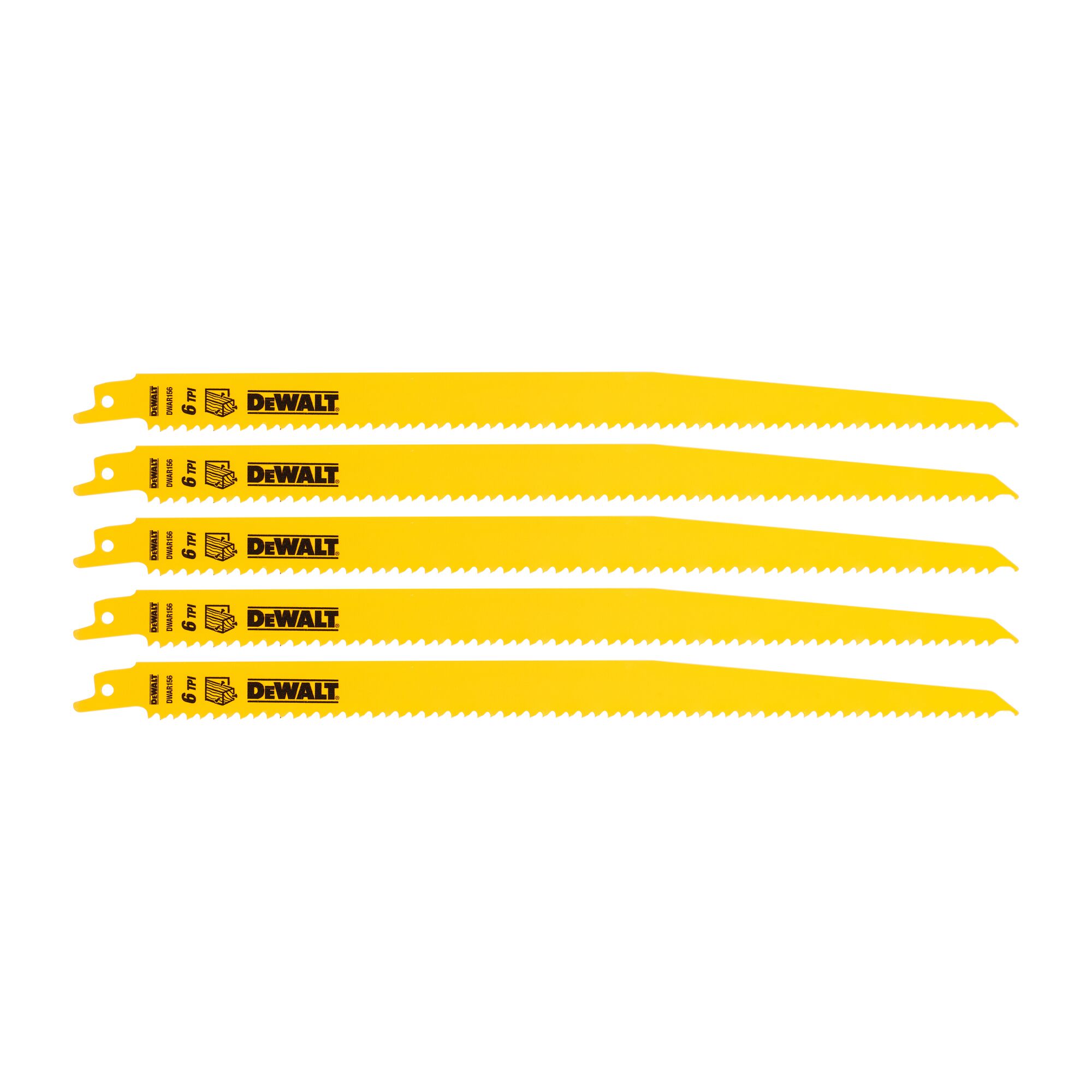 This is 6 Teeth Per Inch Wood 305mm Cutting Length Reciprocating Saw Blade Pack of 5 manufactured by DeWALT. The manufacturer part number is DT2350-QZ. It has 6 number of teeth per inch . It has 5 items per pack . It has about 305mm cutting length . Applications Information involves cutting. It is offered to cut wood materials . It is designed with a reciprocating saw blade type saw blade .