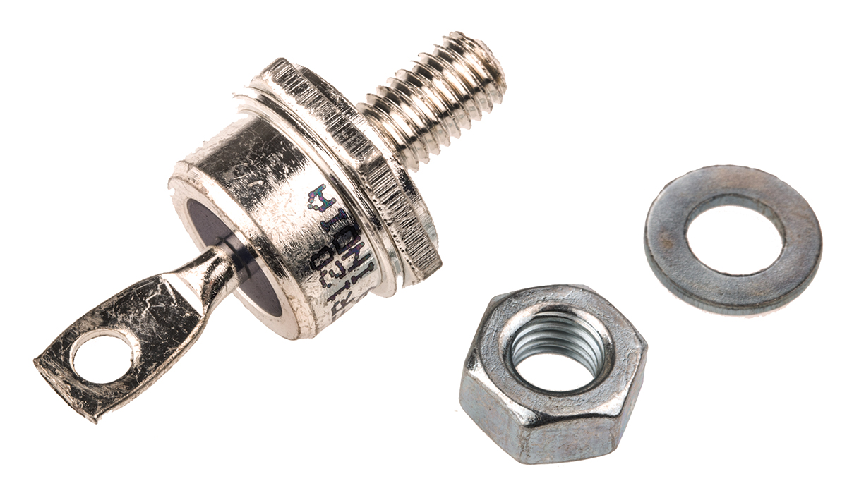 This is Thread Mount Switching Diode Stud Anode 1200V 40A 2-Pin DO-5 manufactured by Vishay. The manufacturer part number is VS-40HFR120. The given dimensions of the product include 22.9 x 20.08 x 17.4mm. The product is available in thread mount configuration. The product utilizes silicon junction diode technology. It has a maximum operating temperature of +190 °c. It features 1.3v of maximum forward voltage drop. In addition, the height is 22.9mm. Furthermore, the product is 17.4mm wide. Its accurate length is 20.08mm. The package is a sort of do-5. It consists of 1 elements per chip. Whereas, the minimum operating temperature of the product is -65 °c. The diode features a stud anode configuration. It contains 2 pins.