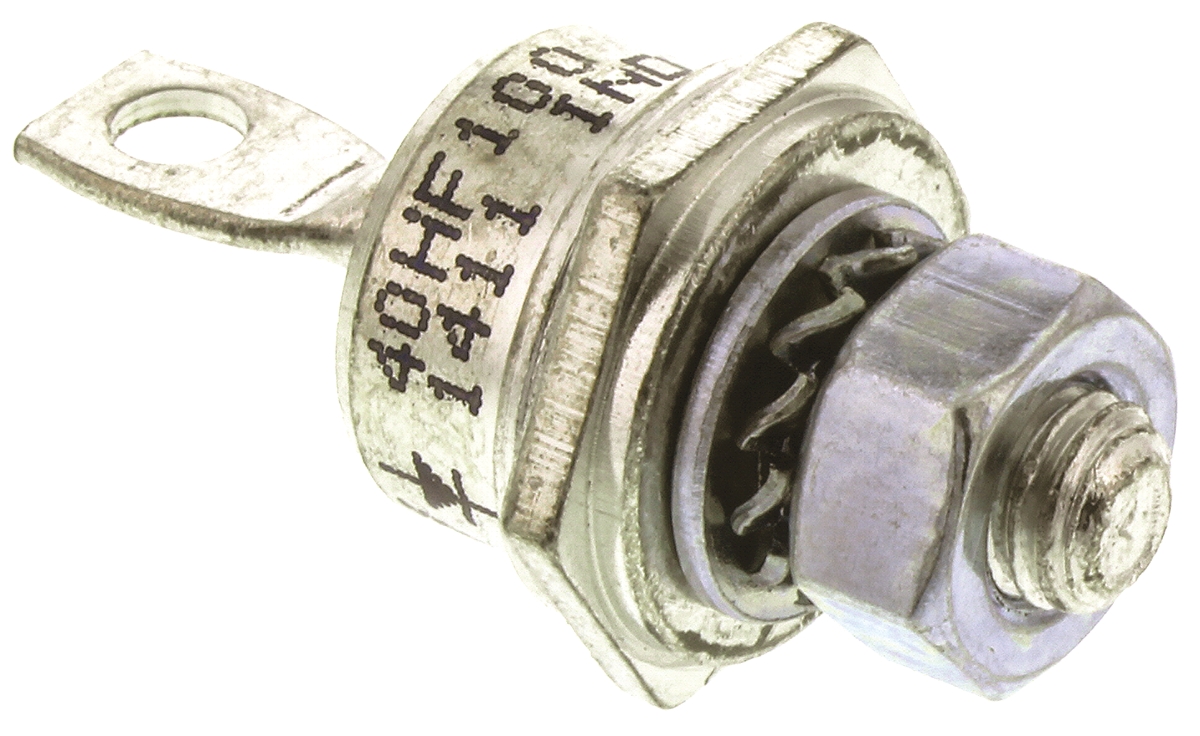 This is Thread Mount Switching Diode Stud Cathode 1000V 40A 2-Pin DO-5 manufactured by Vishay. The manufacturer part number is VS-40HF100. The given dimensions of the product include 22.9 x 20.02 x 17.35mm. The product is available in thread mount configuration. The product utilizes silicon junction diode technology. It has a maximum operating temperature of +190 °c. It features 1.3v of maximum forward voltage drop. In addition, the height is 22.9mm. Furthermore, the product is 17.35mm wide. Its accurate length is 20.02mm. The package is a sort of do-5. It consists of 1 elements per chip. Whereas, the minimum operating temperature of the product is -65 °c. The diode features a stud cathode configuration. It contains 2 pins.