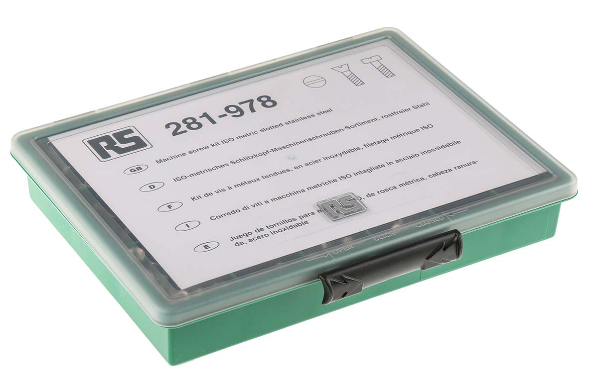 This is 3168 piece Stainless Steel Screw/Bolt Kit M2 M2.5 M3 M4 M5 M6 manufactured by RS Pro. The manufacturer part number is 281-978. A quality product with a nice plain finish. The head has a flat, pan shape. It has a standard 25mm screw/bolt longest length . The product features a slot drive. The product is made from highly stable and reliable stainless steel. It has a machine screw type bolt/screw . It has a typical thread size of m2, m2.5, m3, m4, m5, m6. It has about 6 → 25mm screw/bolts lengths . The stainless steel is a a2 304. With a 6mm screw/bolt shortest length . The product consists of 3168 pieces.