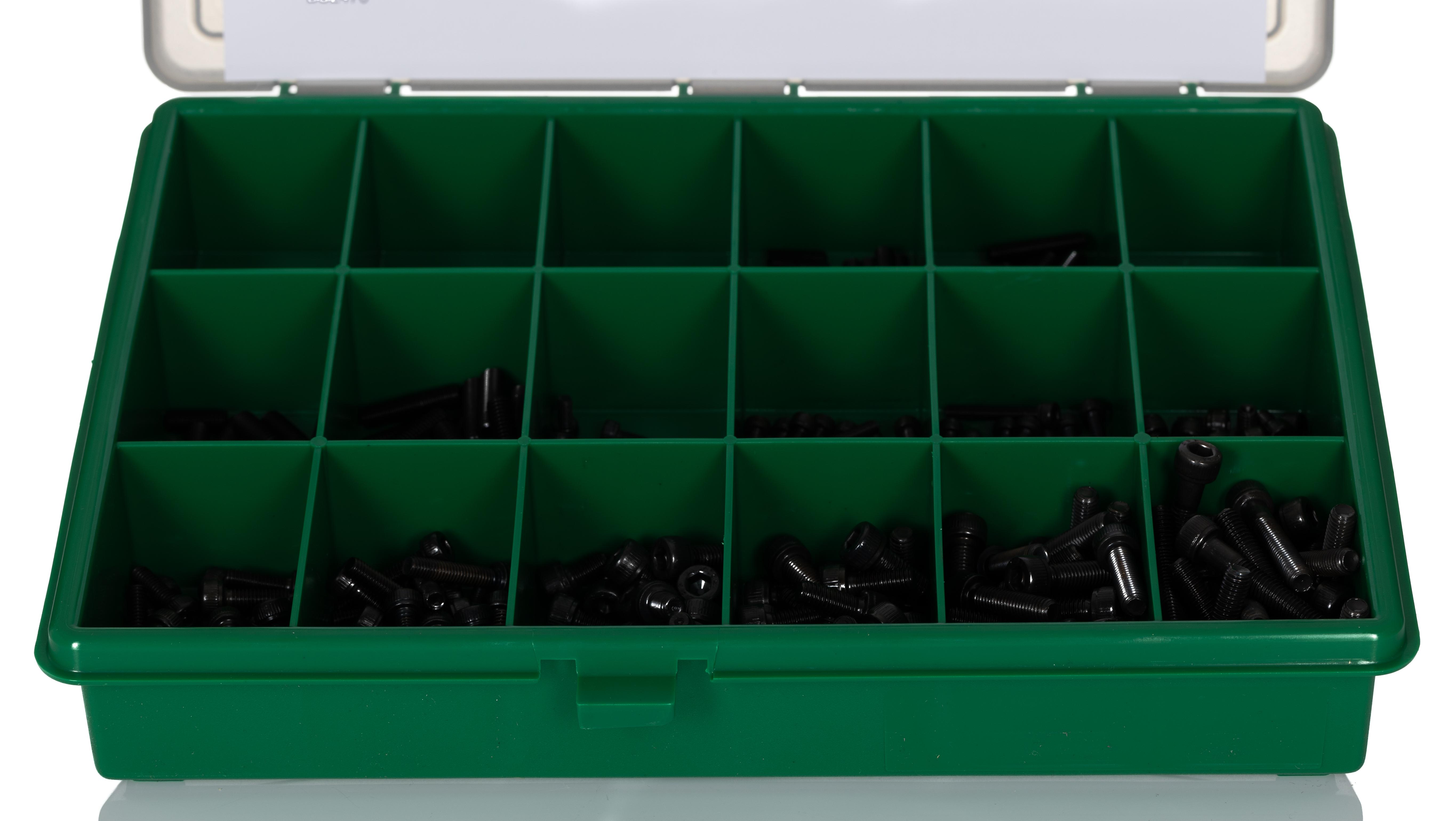 This is 450 piece Steel Screw/Bolt Kit M3 M4 M5 manufactured by RS Pro. The manufacturer part number is 524-051. A quality product with a nice black oxide finish. The head has a hex socket cap shape. It has a standard 30mm screw/bolt longest length . The product features a hex socket drive. The product is made from highly stable and reliable steel. It has a grub screw type bolt/screw . It has a typical thread size of m3, m4, m5. It has about 6 → 30mm screw/bolts lengths . With a 6mm screw/bolt shortest length . The product consists of 450 pieces.