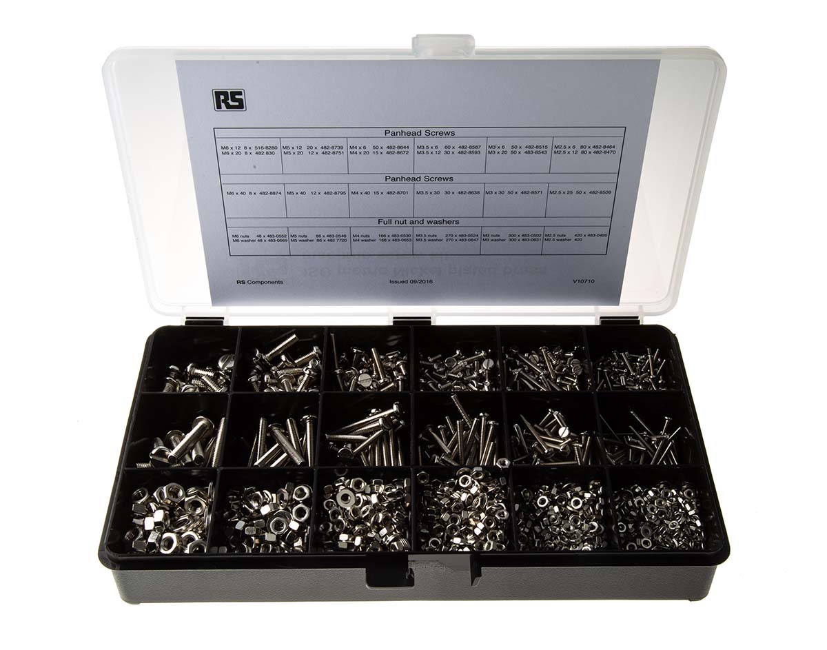 This is 3240 piece Brass Screw/Bolt Kit M2.5 M3 M3.5 M4 M5 M6 manufactured by RS Pro. The manufacturer part number is 482-7742. A quality product with a nice nickel plated finish. The head has a pan shape. It has a standard 40mm screw/bolt longest length . The product features a slot drive. The product is made from highly stable and reliable brass. It has a machine screw type bolt/screw . It has a typical thread size of m2.5, m3, m3.5, m4, m5, m6. It has about 6 → 40mm screw/bolts lengths . With a 6mm screw/bolt shortest length . The product consists of 3240 pieces.