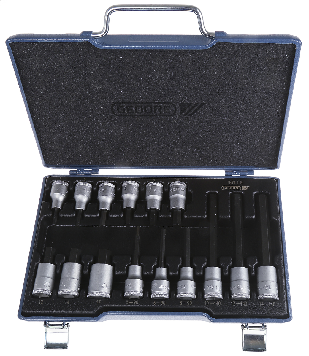 This is 15 pieces Vanadium Steel Driver Bit Set Driver Bit Set manufactured by Gedore. The manufacturer part number is IN 19 LKM. It has a hexagon head and is ideal choice for a variety of demanding applications. The product features a hex drive. The product is made from highly stable and reliable vanadium steel. It has an overall length of 320 mm. The product has a drive size of 1/2 in. The product consists of 15 pieces. It comes in driver bit set configuration. The product is available in hex 5, hex 6, hex 7, hex 8, hex 9, hex 10, hex 12, hex 14, hex 17, hex 19 size.