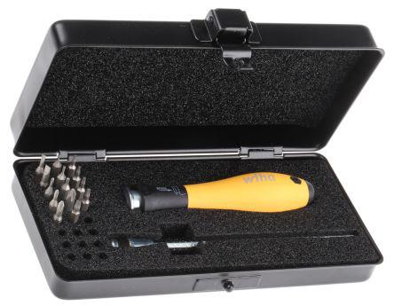 This is 16 pieces ESD Mixed Bit Set Driver Bit Set manufactured by Wiha Tools. The manufacturer part number is 33503. The product consists of 16 pieces. It has a hexagon, phillips, slotted, torx head and is ideal choice for a variety of demanding applications. It comes in driver bit set configuration. The product is available in hex 0.9, hex 1.3, hex 1.5, ph0, ph00, ph000, ph1, sl2, sl3, t4, t5, t6, t8 size.
