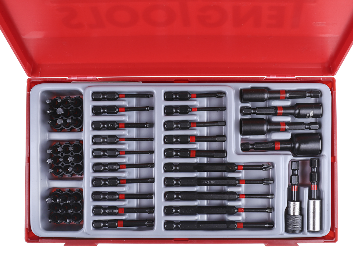 The Teng Tools TTBS53 series is a 53 piece 1/4" hex impact bit set. It includes all the most commonly used screwdriver, hex and TX bits in various lengths to suit different applications and also includes metric and AF impact nut setters. New design impact bits and adaptors for higher torsion Suitable for use with impact power tools Supplied in the unique Teng Tools TC tray Removable lid and dove tail joints