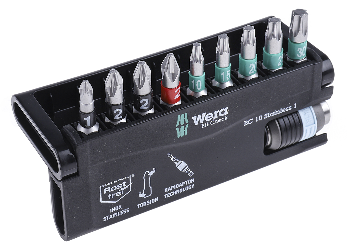 This is Driver Bit Set 10 Pieces Hexagon Phillips Pozidriv Torx manufactured by Wera. The manufacturer part number is 05071110001. It has a hexagon, phillips, pozidriv, torx head and is ideal choice for a variety of demanding applications. The product is made from highly stable and reliable stainless steel. It has a model bit-check 10 stainless 1. The product is available in hex 1/4, ph2, pz1, pz2, t10, t15, t20, t25, t30 size. It comes in driver bit set configuration. The product consists of 10 pieces.
