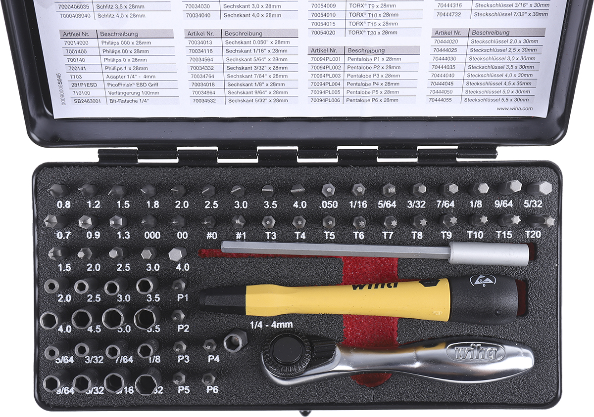 Hex 1.3, Hex 1.5, Hex 1/16, Hex 1/4, Hex 1/8, Hex 2, Hex 2.5, Hex 3, Hex 3.5, Hex 3/16, Hex 3/32, Hex 4, Hex 4.5, Hex 5, Hex 5.5, Hex 5/32, Hex 5/64, Hex 7/32, Hex 7/64, Hex 9/64, PH0, PH00, PH000, PH1