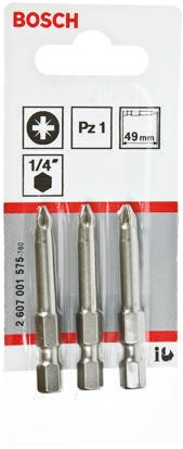 This is 3 pieces Driver Bit Pozidriv Driver Bit PZ1 manufactured by Bosch. The manufacturer part number is 2607001575. It has a pozidriv head and is ideal choice for a variety of demanding applications. It comes in driver bit configuration. The product is available in pz1 size.