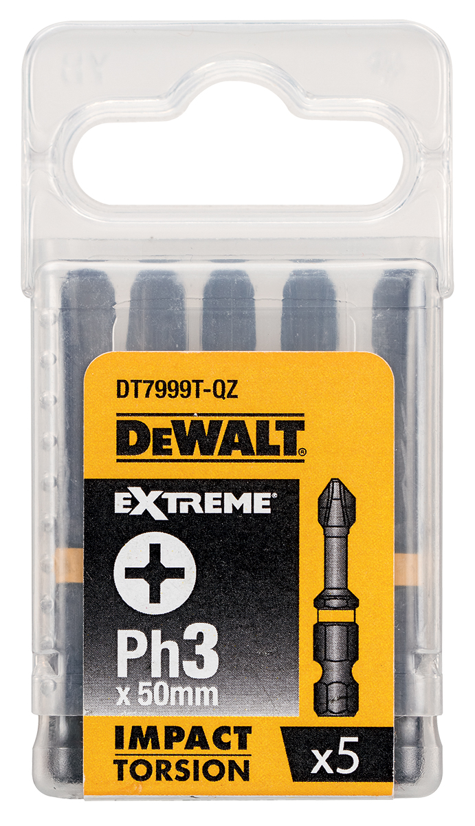 This is 5 pieces Impact Torsion Screwdriver Bit Phillips Driver Bit PH3 manufactured by DeWALT. The manufacturer part number is DT7999T-QZ. It has a phillips head and is ideal choice for a variety of demanding applications. It comes in impact driver bit configuration. The product is available in ph3 size.