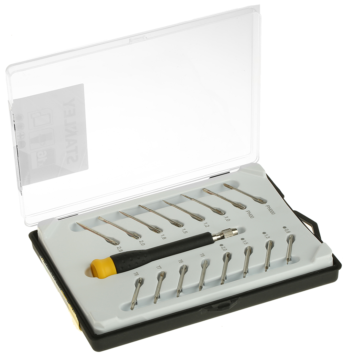 This is 16 pieces Precision Hexagon Phillips Slotted Torx Screwdriver Set manufactured by Stanley. The manufacturer part number is STHT0-62633. This interchangeable standard screwdriver set screwdriver offers extreme comfort and a non-slip grip. The tip is hex: 0.9, 1.3, 1.5, 2mm; slotted:1, 1.2, 1.5, 1.8, 2, 2.5mm; phillips: ph000, ph00; torx: t5, t6, t7, t8 in size. The built-in exquisite tip is a hexagon; phillips; slotted; torx tip. The product consists of 16 pieces.