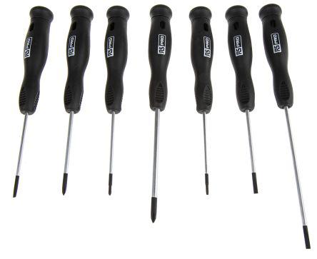 This is 7 pieces Precision Slotted; Phillips Screwdriver Set manufactured by RS Pro. The manufacturer part number is 243-585. This precision screwdriver offers extreme comfort and a non-slip grip. The tip is slotted: 2.5; 3 mm; phillips: ph00; ph0; ph1 in size. The built-in exquisite tip is a slotted; phillips tip. The product consists of 7 pieces.