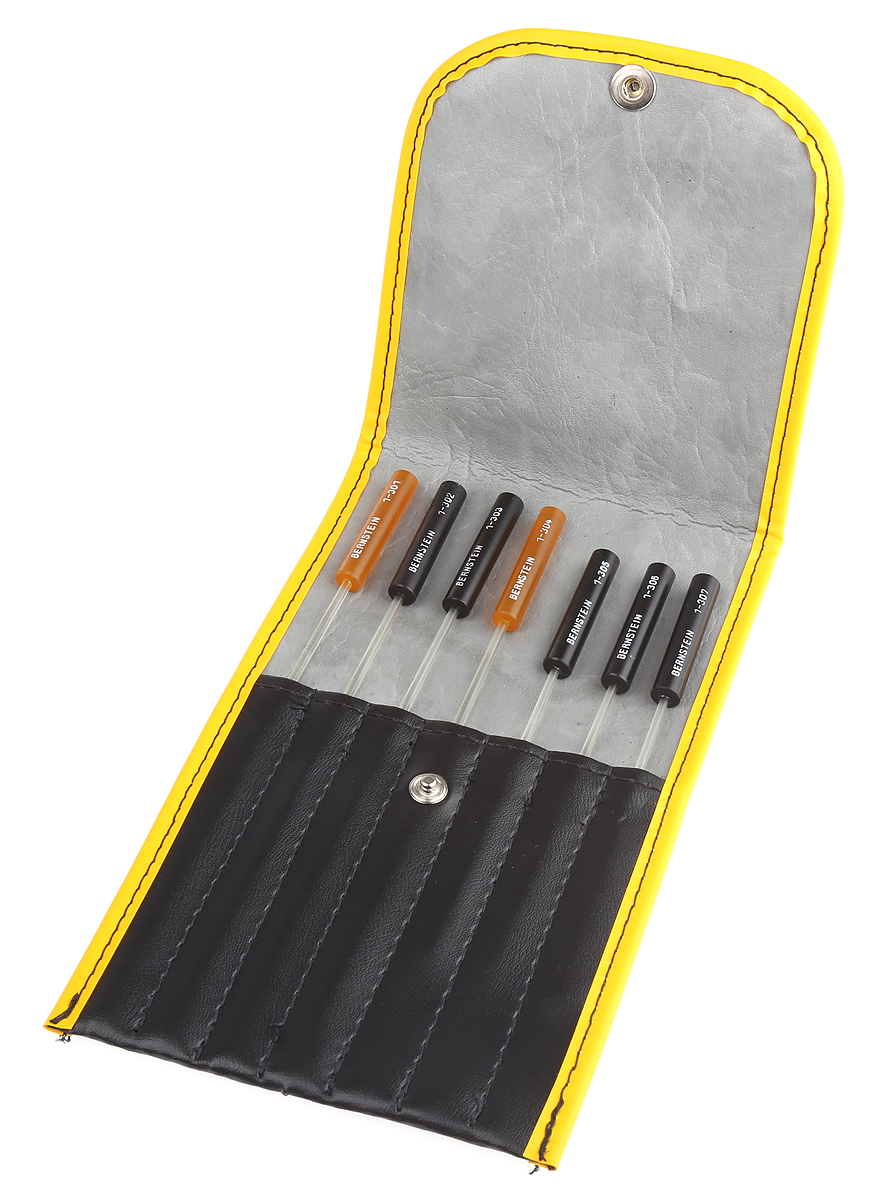 This is 7 pieces Trimmer Screwdriver Set manufactured by Bernstein. The manufacturer part number is 1-300. This precision screwdriver set screwdriver offers extreme comfort and a non-slip grip. The tip is round blade: 2.7; 2.4; inserts: 1.4; 1.1; 1.7; 2; 2.5 mm in size. The built-in exquisite tip is a slotted tip. The product consists of 7 pieces.