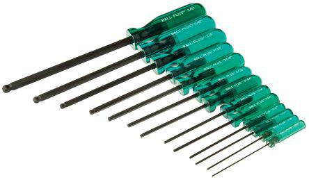 This is 13 pieces Ball Plus Screwdriver Set manufactured by Allen. The manufacturer part number is 56182. The tip is allen: 0.05; 1/16; 5/64; 3/32; 7/16; 1/8; 9/64; 5/32; 3/16; 7/32; 1/4; 5/16; 3/8 in in size. Its comfortable handle is manufactured from durable cellulose acetate material. Moreover, it has pozidriv:pz1 x 100, pz2 x 125 mm set contents . The built-in exquisite tip is a ball plus tip. The product consists of 13 pieces.