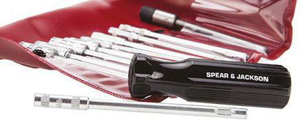 This is 9 pieces Interchangeable Nut Spinner Screwdriver Set manufactured by RS Pro. The manufacturer part number is 438-4251. This interchangeable screwdriver offers extreme comfort and a non-slip grip. The tip is nut spinner 4; 4.5; 5; 5.5; 6; 7; 8; 9; 10 mm in size. The product consists of 9 pieces. The built-in exquisite tip is a nut spinner tip.