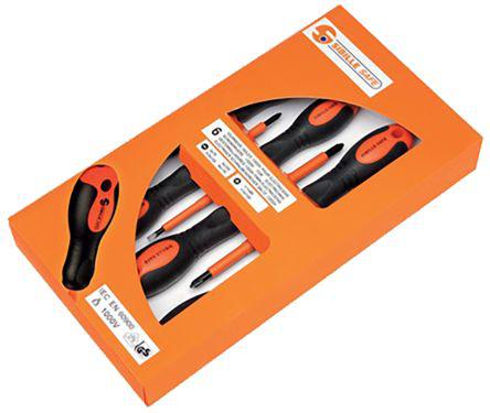 This is Plano 6 pieces Insulated Phillips; Slotted Screwdriver Set manufactured by NEUTRAL. The manufacturer part number is C6RL2. The tip is pl3; pl4; pl6; pl8; ph5; ph6 in size. This insulated screwdriver offers extreme comfort and a non-slip grip. The blade has a length of 80 mm, 100 mm, 150 mm. In addition, its blade is made up of chrome steel material . The built-in exquisite tip is a phillips; slotted tip. The product consists of 6 pieces.