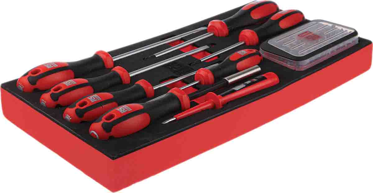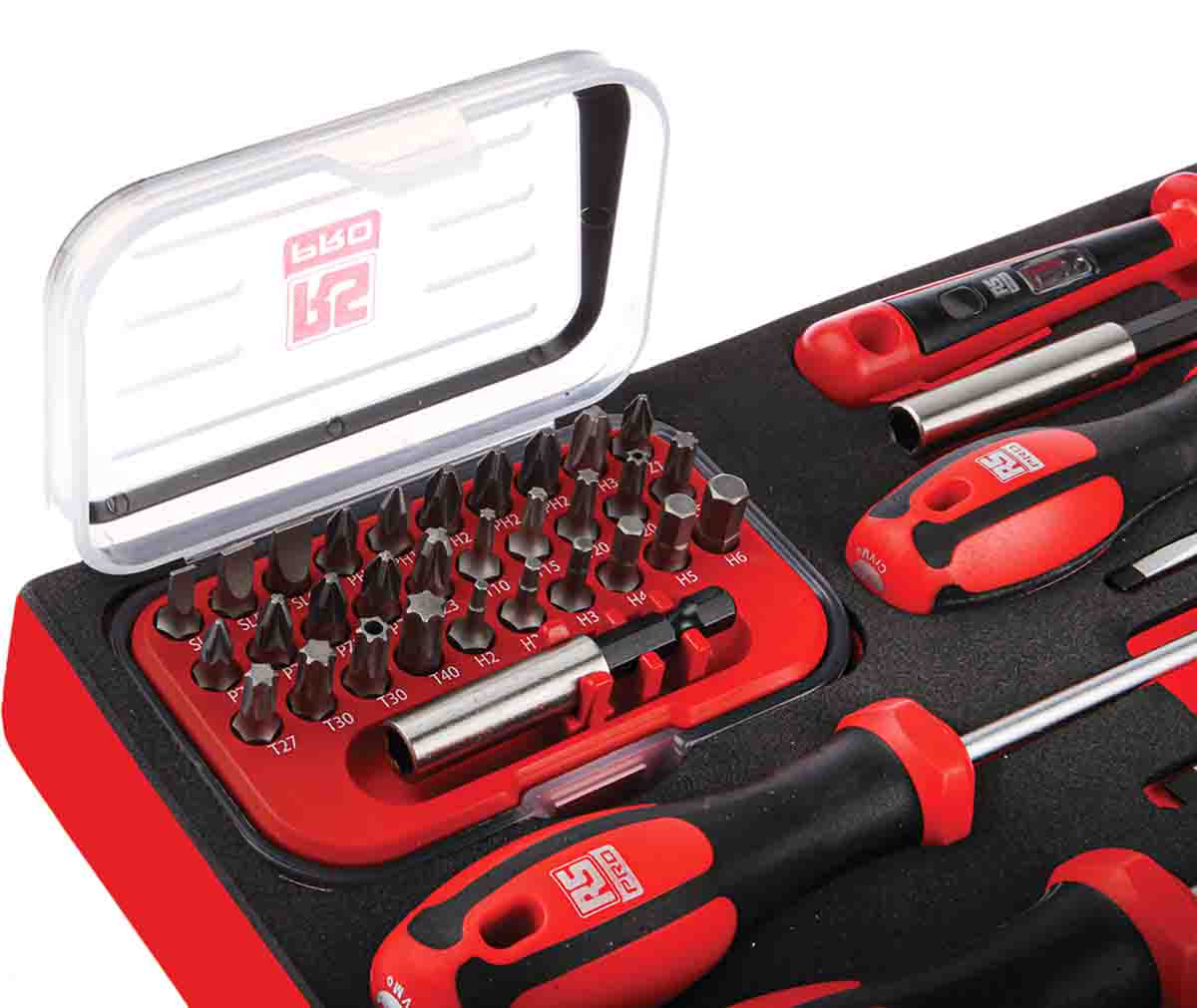 This is 39 pieces Engineers Pozidriv Slotted Screwdriver Set manufactured by RS Pro. The manufacturer part number is 833-5947. This bit holder & standard screwdriver set screwdriver offers extreme comfort and a non-slip grip. The tip is slotted: 3; 4; 5.5; 6.5 mm; pozidriv: pz1; pz2 in size. The built-in exquisite tip is a pozidriv; slotted tip. The product consists of 39 pieces.