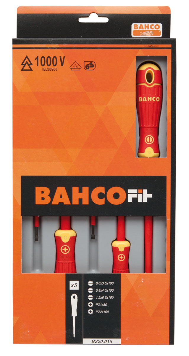 This is Screwdriver Set 5 Piece - Insulated Pozidriv Slotted manufactured by Bahco. The manufacturer part number is B220.015. VDE/1000V Approval Options - yes. This insulated screwdriver set screwdriver offers extreme comfort and a non-slip grip. The tip is 0.6 x 3.5 mm, 0.8 x 4 mm, 1.2 x 6.5 mm, pz1, pz2 in size. The built-in exquisite tip is a pozidriv; slotted tip. The product consists of 5 pieces.