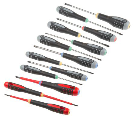 This is Screwdriver Set 13 Piece - Insulated Phillips Pozidriv Slotted Torx manufactured by Bahco. The manufacturer part number is BE-9875. This standard screwdriver set screwdriver offers extreme comfort and a non-slip grip. The tip is 2.72 mm, 3.26 mm, 3.84 mm, 4.4 mm, 0.4 x 2.5 mm, 0.6 x 3.5 mm, 0.8 x 4 mm, 1 x 5.5 mm, 1.2 x 6.5 mm, ph2, pz1, pz2, t10, t15, t20, t25 in size. The built-in exquisite tip is a phillips; pozidriv; slotted; torx tip. The product consists of 13 pieces.