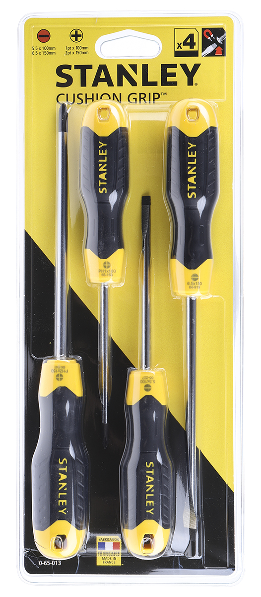 This is Screwdriver Set 4 Piece - Cushion Grip Parallel; Phillips manufactured by Stanley. The manufacturer part number is 0-65-013. This standard screwdriver set screwdriver offers extreme comfort and a non-slip grip. The tip is 5 mm, 6.5 mm, ph1, ph2 in size. The built-in exquisite tip is a phillips; slotted tip. The product consists of 4 pieces.
