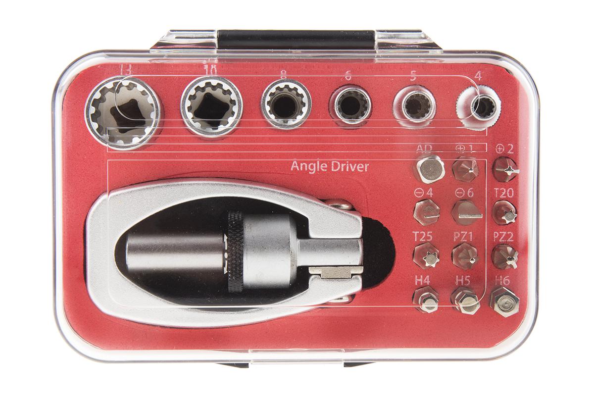 This is 19pcs multi-angle scredriver set manufactured by RS Pro. The manufacturer part number is 144-7953. The tip is 6 mm, h5, h6, hex:h4, ph2, phillips:ph1, pozi:pz1, pz2, slotted:4 mm, t25, torx:t20 in size. This multi-angle screwdriver & blade set screwdriver offers extreme comfort and a non-slip grip. The product consists of 19 pieces.