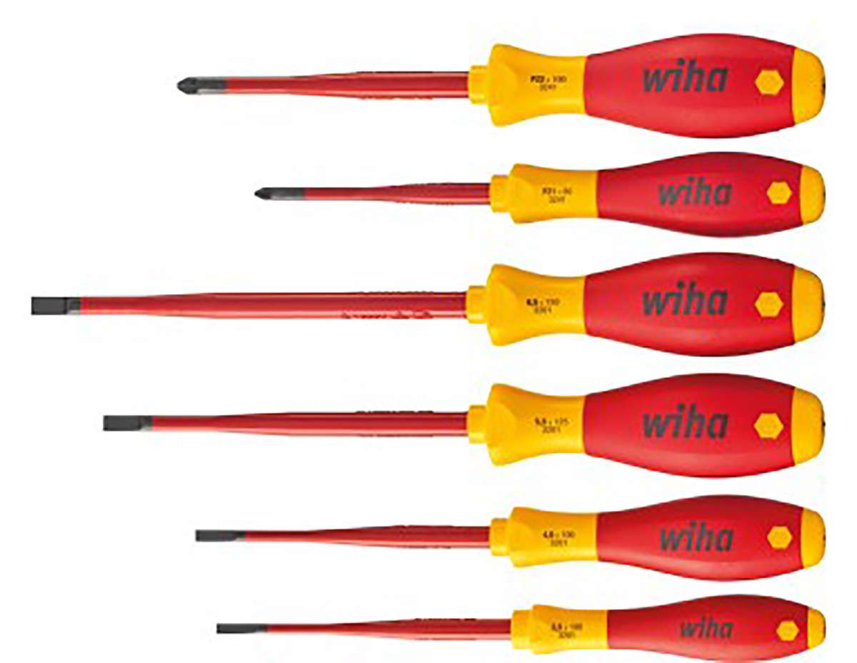 This is Screwdriver Set 6 Piece - Electrical Pozidriv Slotted manufactured by Wiha Tools. The manufacturer part number is 36455. VDE/1000V Approval Options - yes. This insulated screwdriver set screwdriver offers extreme comfort and a non-slip grip. The tip is 3.5 mm, 4 mm, 5.5 mm, 6.5 mm, pz1, pz2 in size. The built-in exquisite tip is a pozidriv; slotted tip. The product consists of 6 pieces.