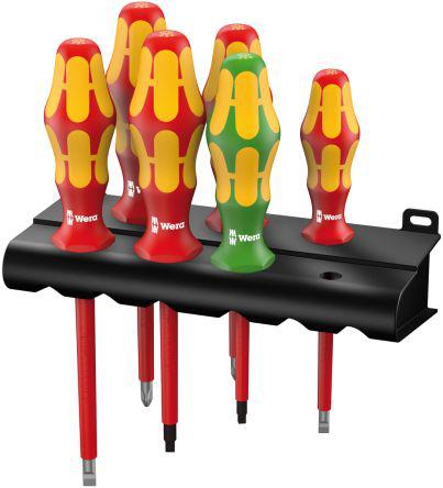 This is Screwdriver Set 6 Piece - Electricians Phillips Slotted Square Socket manufactured by Wera. The manufacturer part number is 05347777050. The tip is ph 2, ph1, 0.6 x 3.5 mm, 1, 1 x 5.5 mm, 2 in size. In addition, it has a zinc phosphate blade finish . This electricians screwdriver offers extreme comfort and a non-slip grip. It has an overall length of 80 (162 i ph vde) mm, 80 (168 i vde) mm, 100 (160 i vde) mm, 100 (162 i ph vde) mm, 100 (168 i vde) mm, 125 (160 i vde) mm. Moreover, it has 160 i vde:1 x 0.6 x 3.5 x 100, 160 i vde:1 x 1 x 5.5 x 125, 162 i ph vde:1 x ph 1 x 80, 162 i ph vde:1 x ph 2 x 100, 168 i vde:1 x #1 x 80, 168 i vde:1 x #2 x 100 set contents . The built-in exquisite tip is a phillips, slotted, square socket tip. The product consists of 6 pieces.