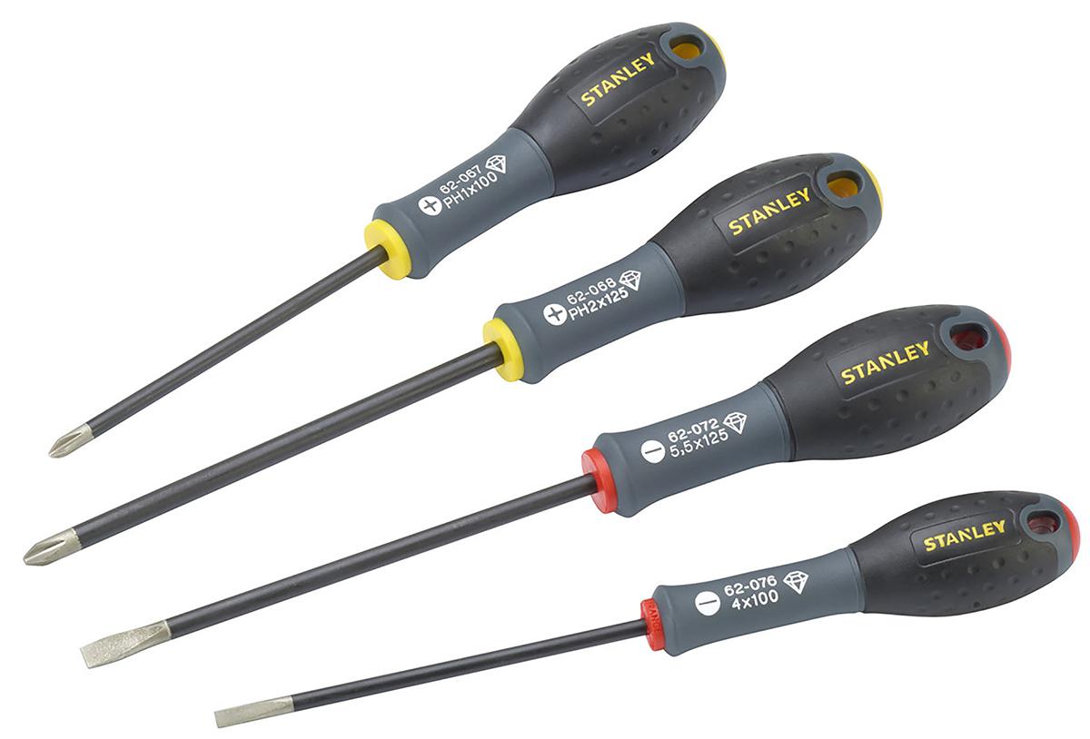 This is Screwdriver Set 4 Piece - Flared Parallel Phillips manufactured by Stanley. The manufacturer part number is FMHT0-62060. This standard screwdriver offers extreme comfort and a non-slip grip. The tip is 4 x 100 mm, 5.5 x 125 mm, ph1 x 100 mm, ph2 x 125 mm in size. The built-in exquisite tip is a flared, parallel, phillips tip. The product consists of 4 pieces.