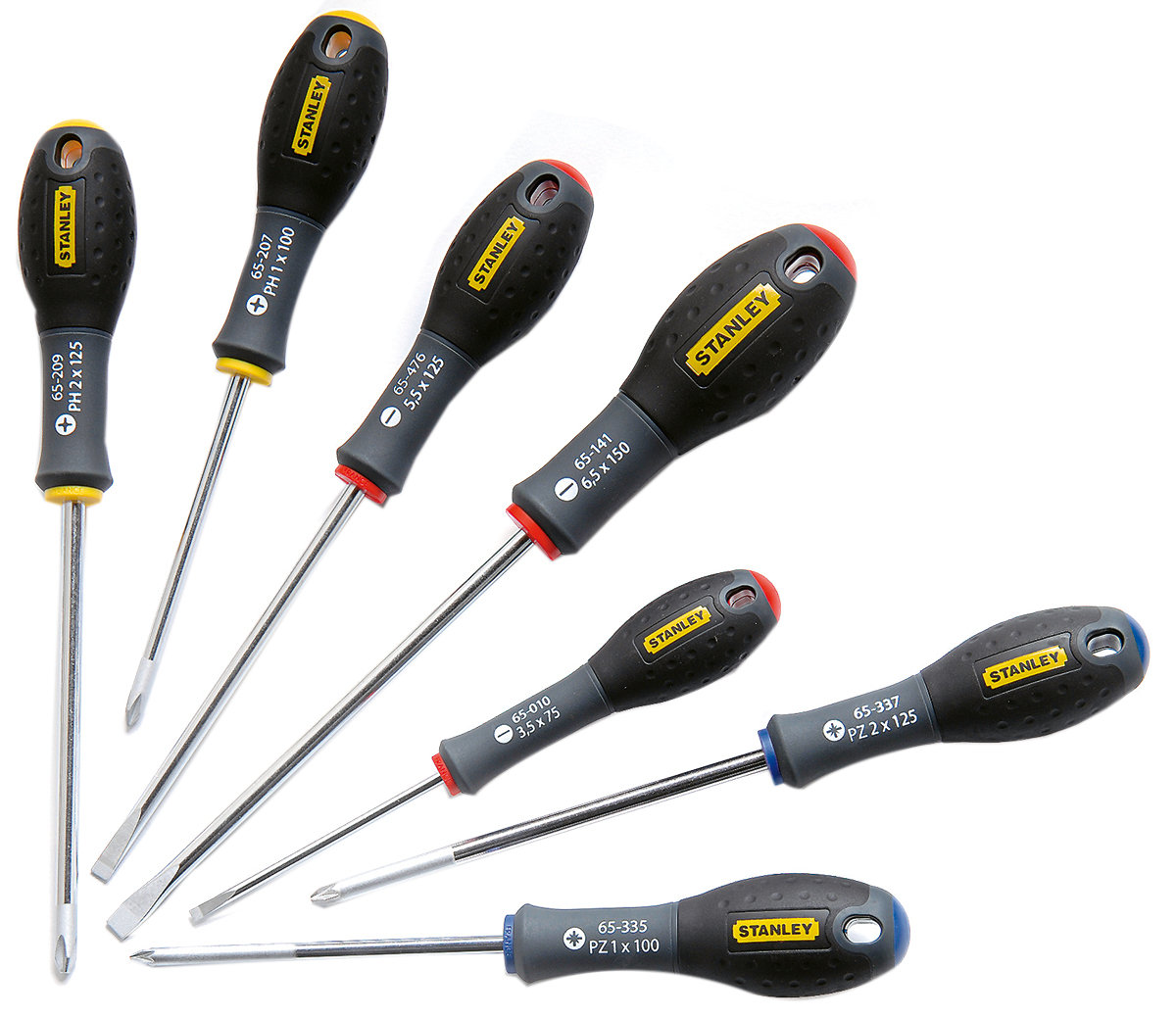 This is Screwdriver Set 7 Piece - Flared Parallel Phillips manufactured by Stanley. The manufacturer part number is 0-65-438. This standard screwdriver set screwdriver offers extreme comfort and a non-slip grip. The tip is 3.5 mm, 5.5 mm, 6.5 mm, ph1, ph2, pz1, pz2 in size. The built-in exquisite tip is a phillips; slotted tip. The product consists of 7 pieces.