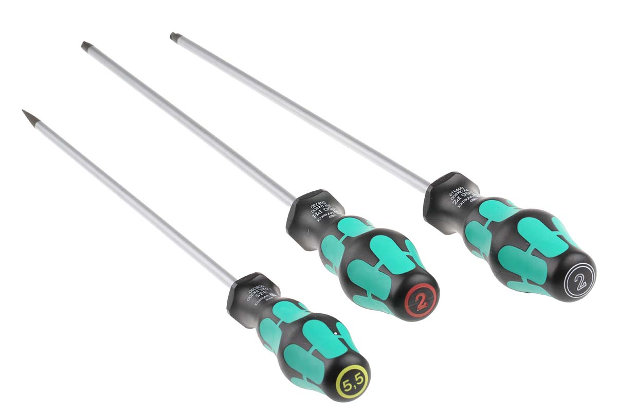 This is Screwdriver Set 3 Piece - Long Reach Slotted; Phillips; Pozidriv manufactured by Wera. The manufacturer part number is 05347735001. This long reach screwdriver offers extreme comfort and a non-slip grip. The tip is ph2, pz2 in size. The built-in exquisite tip is a slotted' phillips' pozidriv tip. The product consists of 3 pieces.