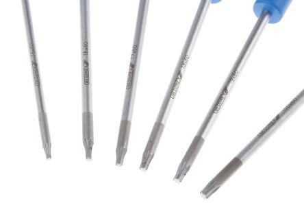 This is Screwdriver Set 6 Piece - Precision Torx manufactured by Gedore. The manufacturer part number is 1902857. This precision screwdriver offers extreme comfort and a non-slip grip. The tip is t10, t5, t6, t7, t8, t9 in size. The built-in exquisite tip is a torx tip. The product consists of 6 pieces.