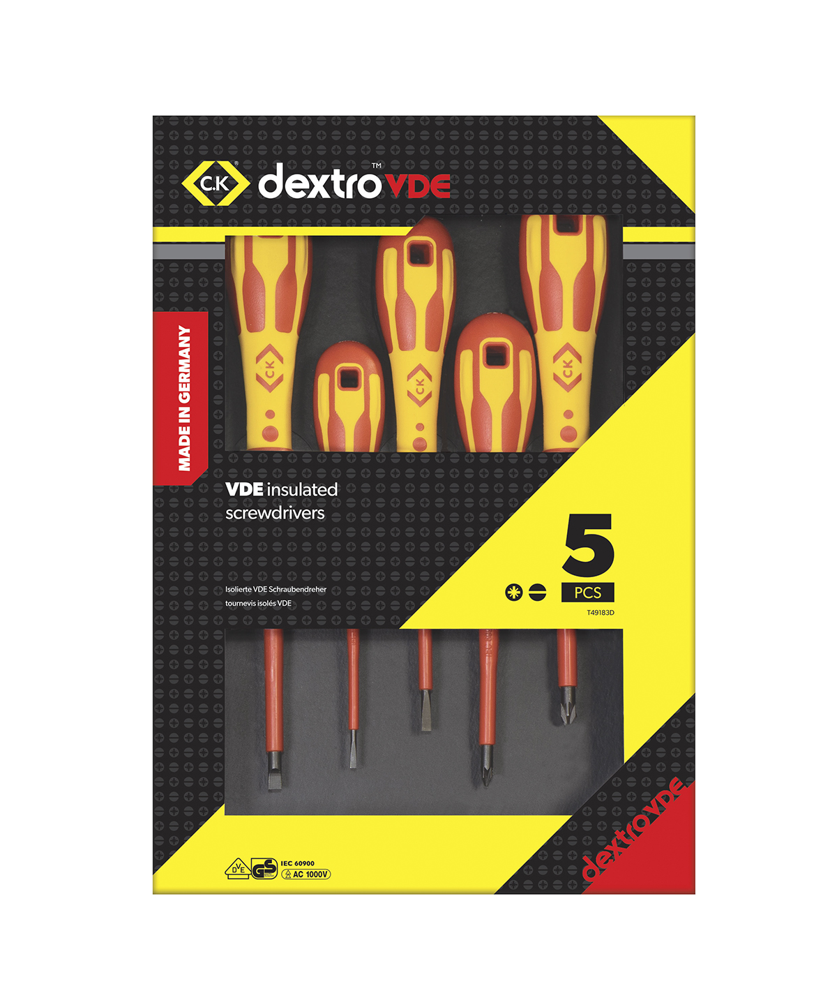 This is - Dextro VDE S/Driver SLP/PZD Se manufactured by CK. The manufacturer part number is T49183D. VDE/1000V Approval Options - yes. This insulated screwdriver set screwdriver offers extreme comfort and a non-slip grip. The tip is mainstester, pz, sizes: 1 x 80 & 2 x 100 mm, slotted parallel:2.5 x 75, 4 x 100 & 5.5 x 125 mm in size. The built-in exquisite tip is a pozidriv; slotted tip. The product consists of 5 pieces.