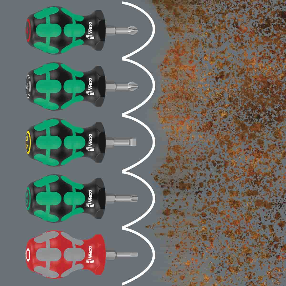 The Wera 05008872001 is a compact and versatile toolkit essential for any professional or DIY enthusiast. This 5-piece set includes Phillips, slotted, and square screwdrivers, each designed for precision and durability. The ergonomic handle ensures a comfortable grip, reducing hand fatigue during extended use. Crafted from high-quality materials, these screwdrivers offer exceptional torque and a long service life. The stubby design allows for easy access to tight and confined spaces, making it ideal for intricate work. With Wera's renowned engineering, this set ensures reliability and performance for various tasks.