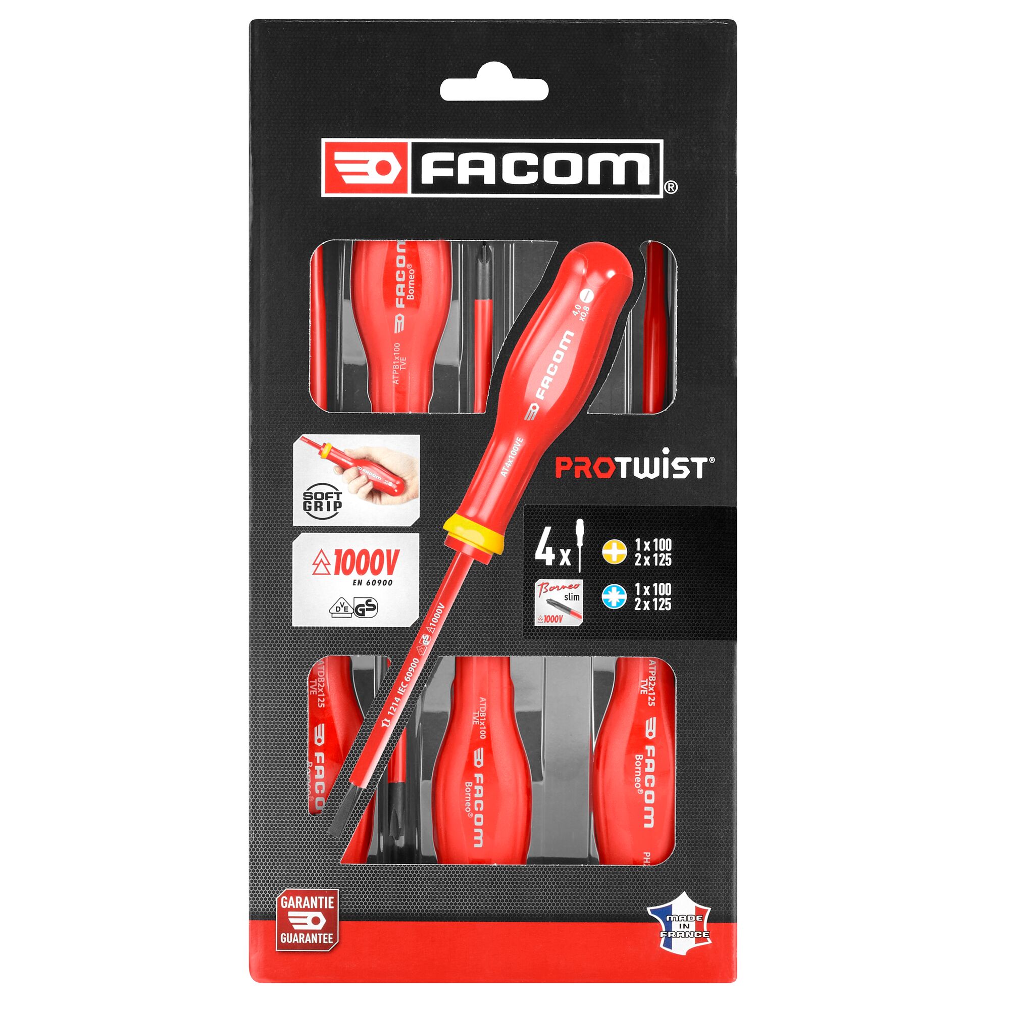 This is 1000V Hex Screwdriver Set 4 Piece manufactured by Facom. The manufacturer part number is ATB.J4TVEPB. This insulated screwdriver offers extreme comfort and a non-slip grip. screwdriver set is a versatile product designed to provide user-defined applications. The built-in exquisite tip is a hexagon tip. The product consists of 4 pieces.