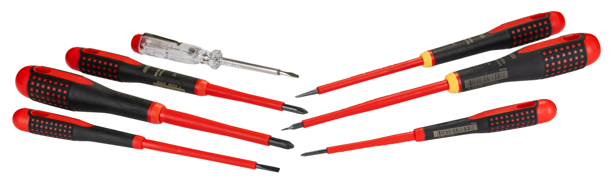This is Standard Hex Screwdriver Set 8 Piece manufactured by Bahco. The manufacturer part number is BE-9887S. VDE/1000V Approval Options - yes. The tip is 0.4 x 2.5, 0.6 x 3.5, 0.8 x 4.0, 1, 1.0 x 5.5, ph1, ph2 in size. This insulated screwdriver set screwdriver offers extreme comfort and a non-slip grip. ESD Safety - no. The built-in exquisite tip is a phillips; slotted tip. The product consists of 7 pieces.
