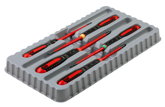 This is Phillips; Slotted; Torx Insulated Screwdriver Set 5-Piece manufactured by Bahco. The manufacturer part number is BE-9871SL. This insulated screwdriver set screwdriver offers extreme comfort and a non-slip grip. The product consists of 5 pieces. The built-in exquisite tip is a phillips; slotted; torx tip. ESD Safety - no.