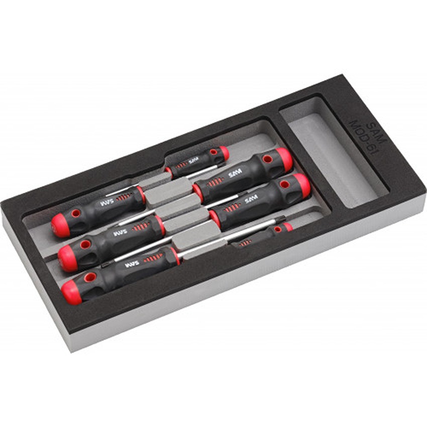 This is Phillips Slotted Standard Screwdriver 7-Piece manufactured by SAM. The manufacturer part number is TA-XJ7MM. This standard screwdriver screwdriver offers extreme comfort and a non-slip grip. The built-in exquisite tip is a phillips, slotted tip. The product consists of 7 pieces.