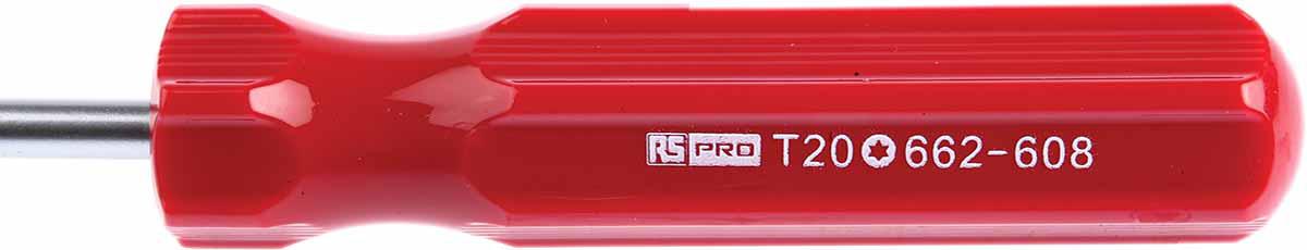 This is 4 in Chrome Vanadium Steel Engineers Screwdriver Torx T20 Tip Cellulose Acetate manufactured by RS Pro. The manufacturer part number is 662-608. This standard screwdriver offers extreme comfort and a non-slip grip. The tip is t20 in size. Its comfortable handle is manufactured from durable cellulose acetate material. The blade has a length of 102 mm. It has an overall length of 189 mm. The built-in exquisite tip is a torx tip. In addition, its blade is made up of chrome vanadium steel material .