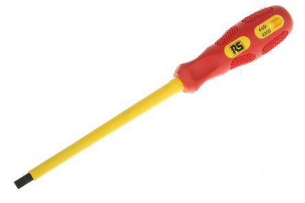 This is 150 mm Chrome Vanadium Steel Insulated Screwdriver Flat 6.5 mm Tip Bi-material manufactured by RS Pro. The manufacturer part number is 449-9369. VDE/1000V Approval Options - yes. The tip is 6.5 mm in size. This standard screwdriver offers extreme comfort and a non-slip grip. The built-in exquisite tip is a flat tip. The blade has a length of 150 mm. Its comfortable handle is manufactured from durable bi-material material. In addition, its blade is made up of chrome vanadium steel material .