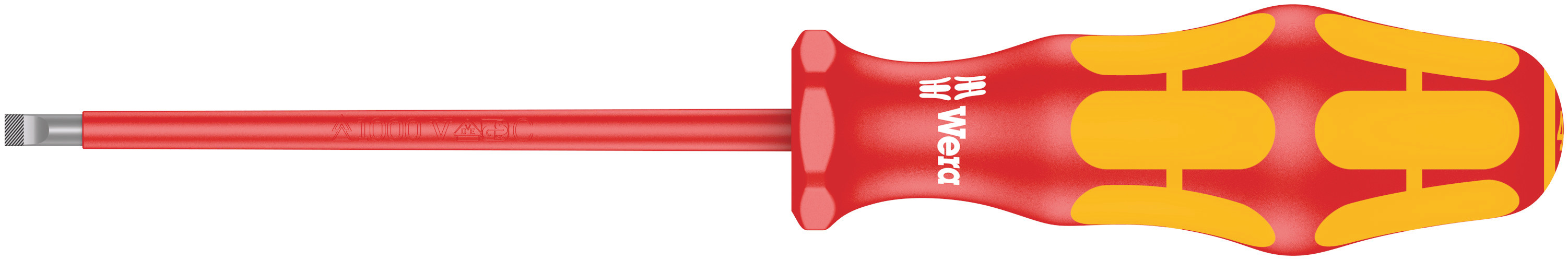 This is 200 mm Insulated Screwdriver Slotted 5.5 mm Tip manufactured by Wera. The manufacturer part number is 05006121001. VDE/1000V Approval Options - yes. The tip is 5.5 mm in size. This insulated screwdriver screwdriver offers extreme comfort and a non-slip grip. The blade has a length of 200 mm. It has an overall length of 298 mm. The built-in exquisite tip is a slotted tip.