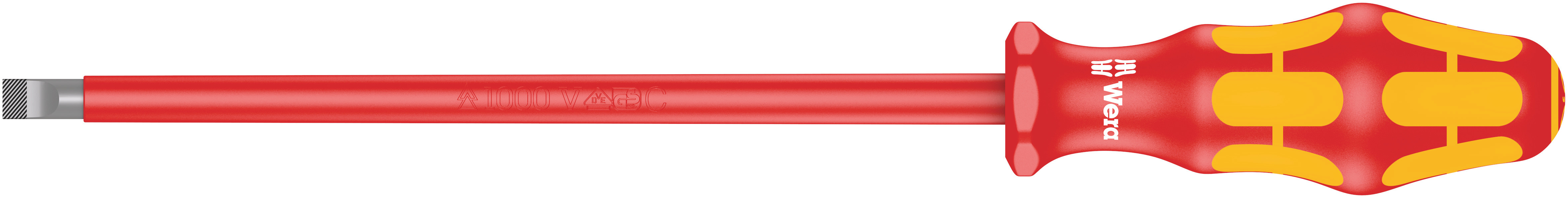 This is 175 mm Insulated Screwdriver Slotted 8 mm Tip manufactured by Wera. The manufacturer part number is 05006135001. VDE/1000V Approval Options - yes. The tip is 8 mm in size. This insulated screwdriver screwdriver offers extreme comfort and a non-slip grip. The blade has a length of 200 mm. It has an overall length of 287 mm. The built-in exquisite tip is a slotted tip.