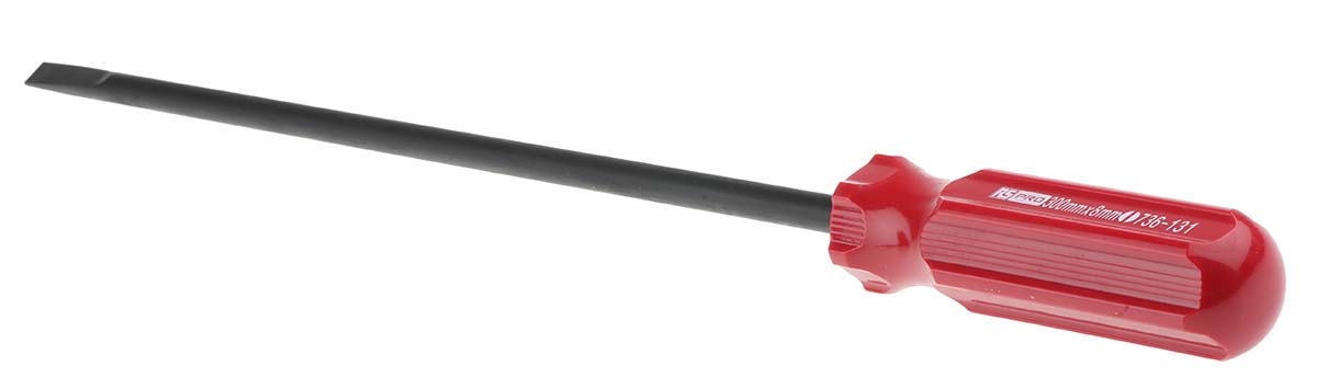 The 736-131 from RS PRO is a long-reach slotted screwdriver designed for high-performance maintenance and assembly workflows in industrial and electrical settings. It features an 8 mm tip, a 300 mm blade length, and an overall length of 420 mm. The blade is forged from chrome-vanadium steel, chemically blackened for corrosion resistance, and the handle is moulded from durable cellulose-acetate for a confident grip. Compact yet effective, the tool offers the reach and robustness required in cabinet builds, equipment servicing and component-installation operations.