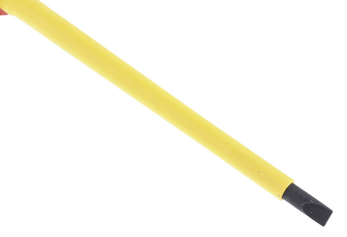 This is 125 mm Chrome Vanadium Steel Insulated Screwdriver Flat 5.5 mm Tip Bi-material manufactured by RS Pro. The manufacturer part number is 449-9353. VDE/1000V Approval Options - yes. The tip is 5.5 mm in size. Its comfortable handle is manufactured from durable bi-material material. In addition, it has a black oxidized blade finish . The blade has a length of 125 mm. The built-in exquisite tip is a slotted tip. In addition, its blade is made up of chrome vanadium steel material .