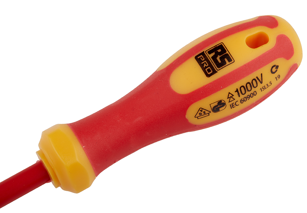 This is 100 mm Chrome Vanadium Molybdenum Steel Insulated Screwdriver Slotted 0.6 x 3.5 mm Tip Plastic manufactured by RS Pro. The manufacturer part number is 125-3080. VDE/1000V Approval Options - yes. This insulated screwdriver screwdriver offers extreme comfort and a non-slip grip. The tip is 3.5 x 0.6 mm in size. Its comfortable handle is manufactured from durable plastic material. In addition, it has a phosphate blade finish . The blade has a length of 100 mm. It has an overall length of 190 mm. The built-in exquisite tip is a slotted tip. In addition, its blade is made up of chrome vanadium molybdenum steel material .